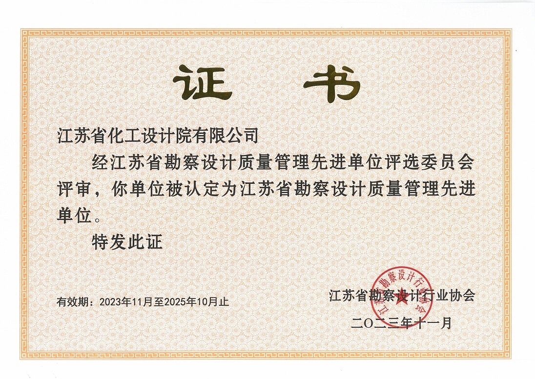 經江蘇省勘察設計質量管理先進單位評選委員會評審,我院被認定為江蘇省勘察設計質量管理先進單位!